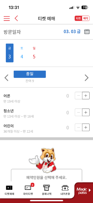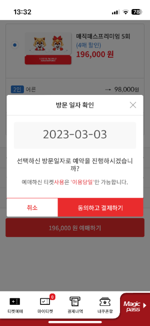 - 롯데월드 방문 3일 전 밤 12시에 매직패스 티켓 예약이 열려서 이때 재빠르게 티켓팅하셔야 합니다. 3월 3일 기준 앱에 들어가시면 3월 3일, 4일, 5일 3일 치 티켓이 오픈되어 있습니다.