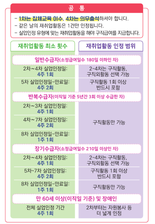 | 기타 재취업활동 | •고용센터 담당자가 지시한 봉사활동 참여(4시간 이상 1회 인정) | |