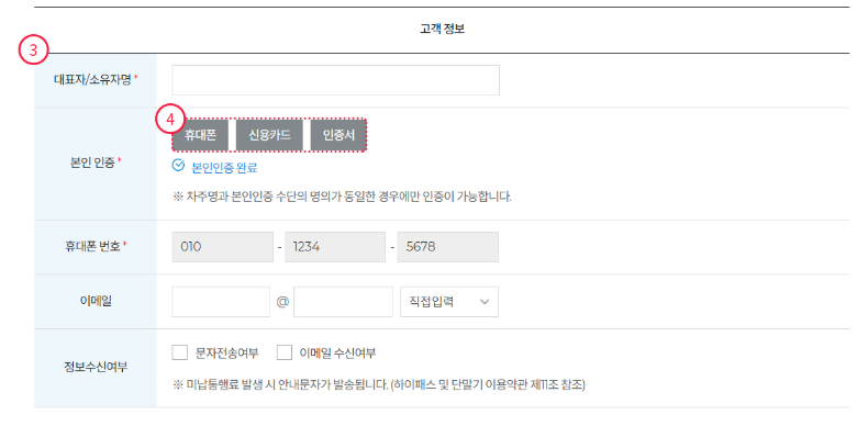 휴대폰, 신용카드, 공동인증서 등 본인인증 절차를 진행하시면 하이패스 등록 완료입니다.