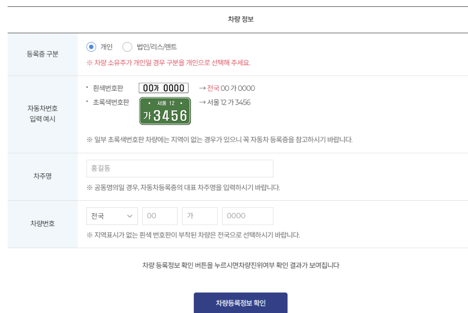 이후 자신의 차량정보, 차주명 등을 입력하시고 [차량등록정보 확인]을 눌러줍니다.