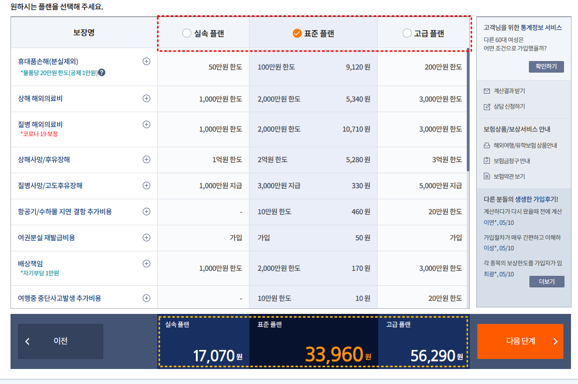 삼성화재 여행자 보험의 경우 실속플랜, 표준플랜, 고급플랜 3가지로 나뉘어져 있으며 각 플랜마다 가격과 보장 내용이 다릅니다. 따라서 개인별로 원하시는 플랜을 선택하시면 됩니다.