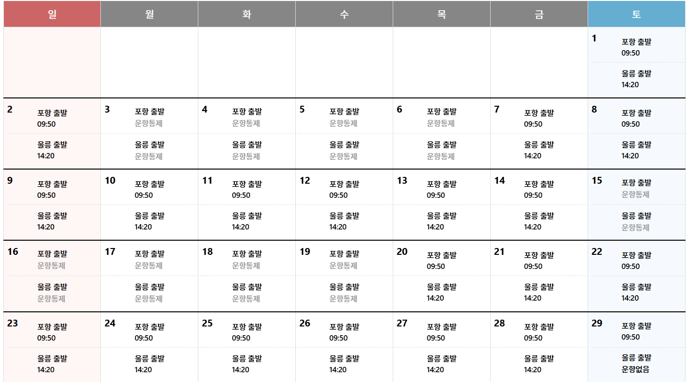일반적으로 하루 한 차례, 오전 9시 50분에 포항 여객선터미널에서 출발하며 약 2시간 50분이 소요됩니다.