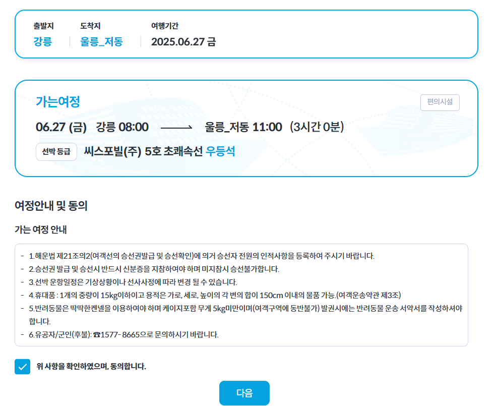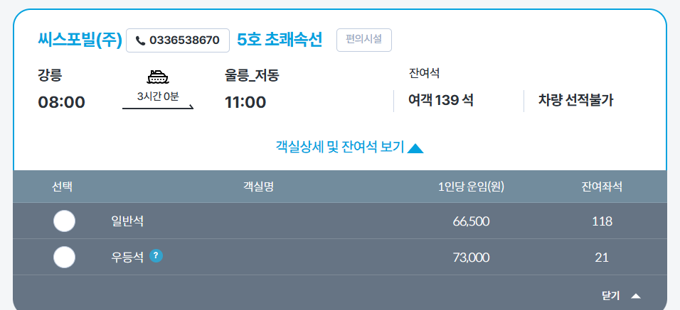 강릉-울릉도 배편은 하루 한 번뿐입니다.