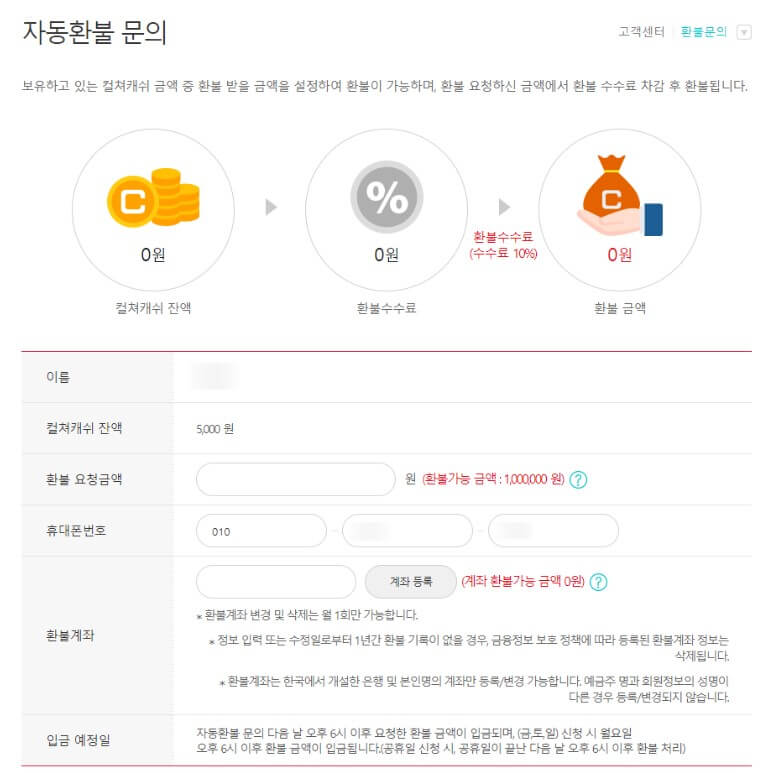 - 사용 안 한 컬쳐캐시 10% 차감 후 입금 / 사용 한 컬쳐캐시 500원 차감 후 입금