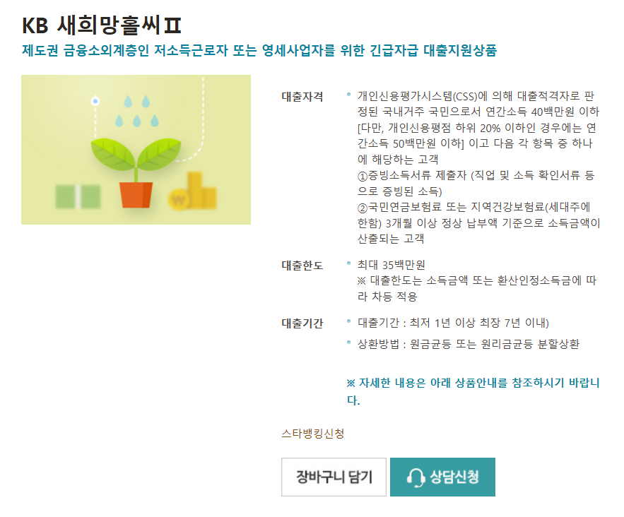 국민은행 새 희망홀씨 2는 금융소외계층인 저소득 근로자 및 영세사업자를 위한 긴급자금 대출 지원 상품입니다.