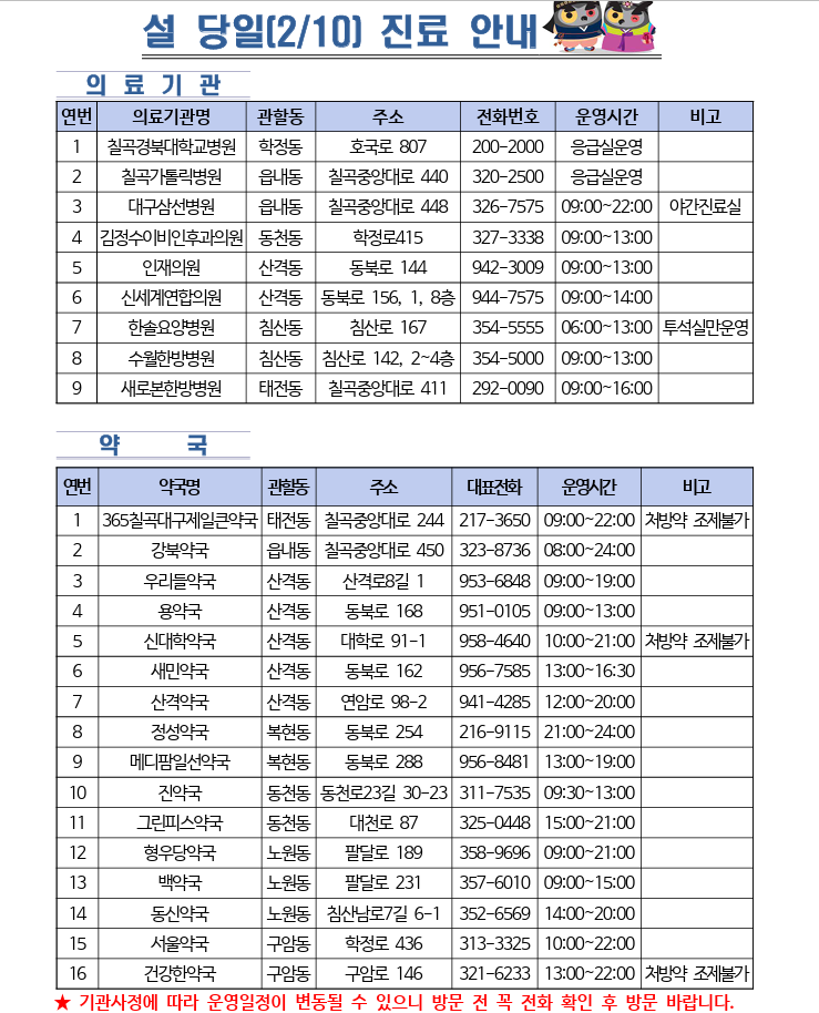 설연휴 대구 동구에 영업을 하는 약국과 병원 리스트, 진료시간은 아래의 엑셀파일에서 확인해 주세요.