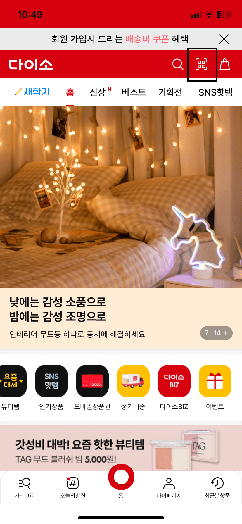 2. 다이소몰 앱 화면에서 우측 상단 [QR 코드] → [매장 상품찾기] 를 선택하시기 바랍니다.