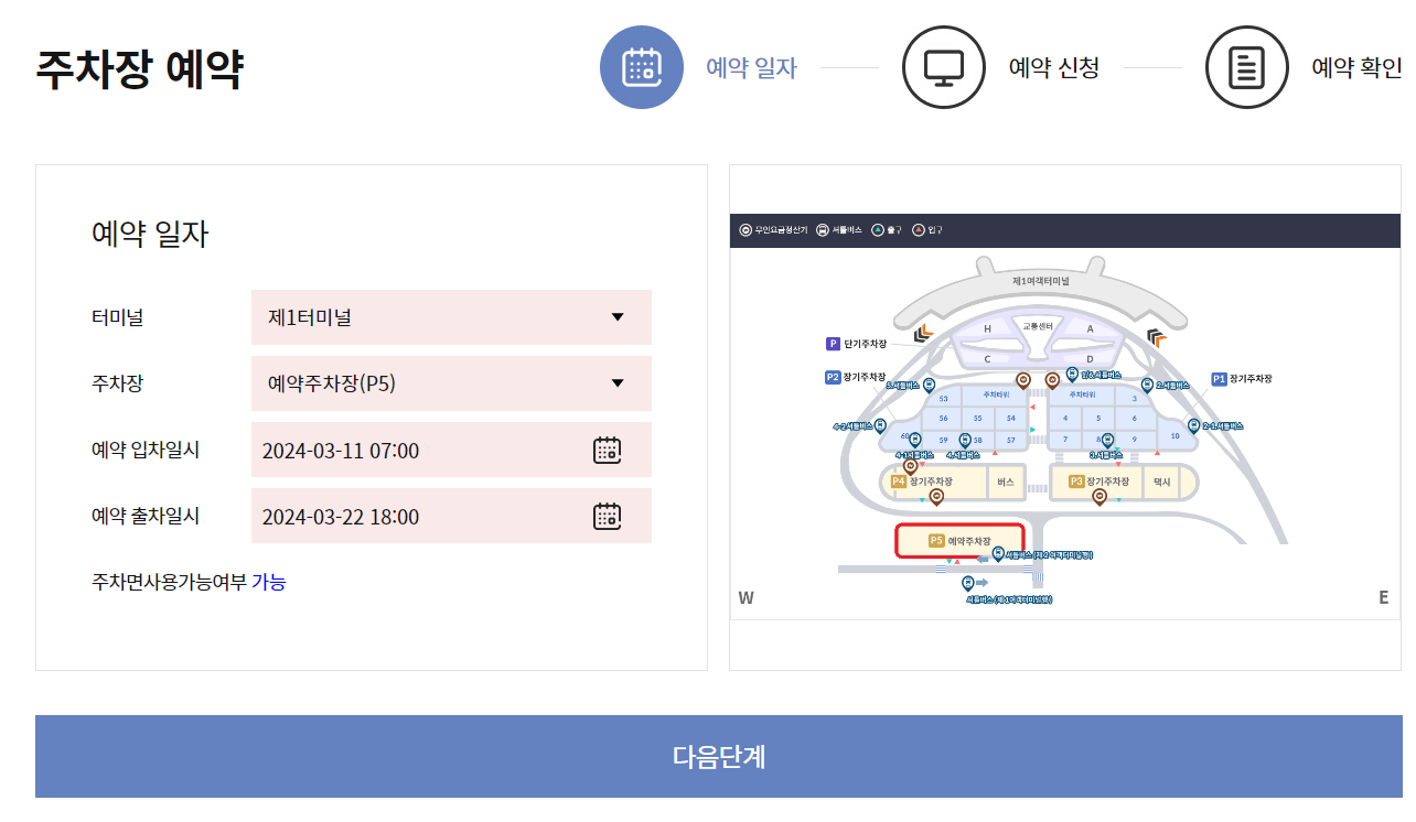 (3) 터미널, 주차장, 입차일 시, 출차일시를 입력하시고 예약하기를 선택 후 예약 내용 확인하고 다음단계 선택하세요.
