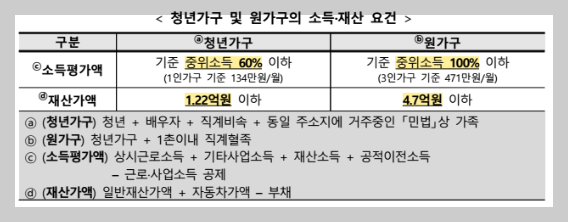청년 본인가구와 부모 등을 포함하는 원가구의 소득 및 재산을 모두 고려합니다.