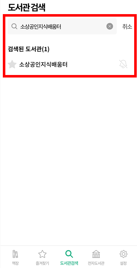 ②앱 설치 후 도서관 검색창에 "소상공인지식배움터"를 검색합니다.