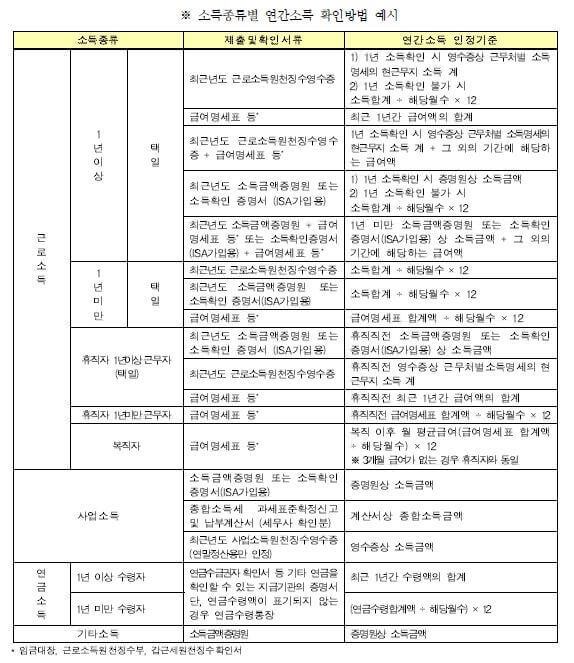 근로소득, 사업소득, 연금소득 등 자세한 내용은 아래의 표를 기준으로 하시기 바랍니다.