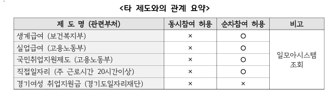 다른 프로그램과 경기여성취업지원금 프로그램과 동시참여는 불가합니다. 단, 타 제도 종료 6개월 경과 후 참여는 가능합니다.