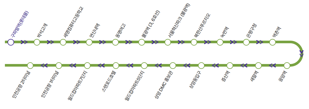 구파발역 ▶ 박석고개 ▶ 세명컴퓨터고등학교 ▶ 연신내역 ▶ 동명여고 ▶ 불광역 ▶ 서울혁신파크 ▶ 북한산푸르지오 ▶ 녹번역 ▶ 은평구청 ▶ 역촌역 ▶ 응암역 ▶ 새절역 ▶ 증산역 ▶ 상암동입구 ▶ 상암DMC홍보관 ▶ 월드컵아파트5단지 ▶ 스탠포드호텔 ▶ 월드컵아파트7단지 ▶ 인천공항