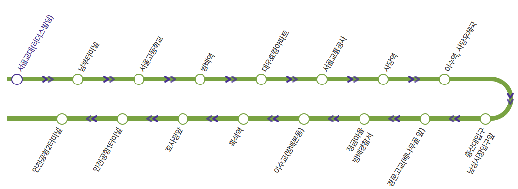 서울교대 ▶남부터미널 ▶서울고등학교 ▶방배역 ▶대우효령아파트 ▶서울교통공사 ▶사당역 ▶이수역, 사당우체국 ▶총신대입구, 남성시장입구앞 ▶경문고교 ▶정금마을 방배경찰서 ▶이수교 ▶흑석역 ▶효사정앞 ▶인천공항