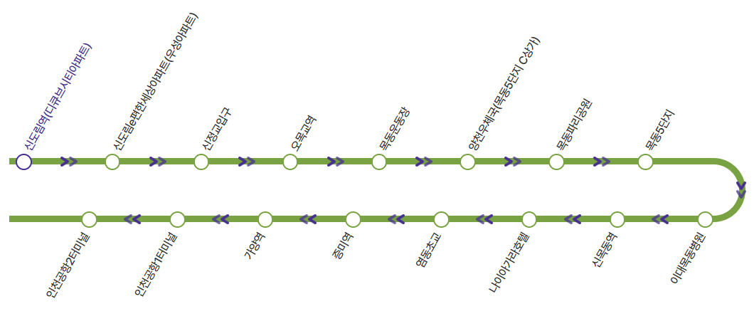 신도림역 ▶신도림E편한세상 ▶신정교입구 ▶오목교역 ▶목동운동장 ▶양천우체국 ▶목동파리공원 ▶목동5단지 ▶이대목동병원 ▶신목동역 ▶나이아가라호텔 ▶염동초교 ▶ 증미역 ▶ 가양역 ▶ 인천공항