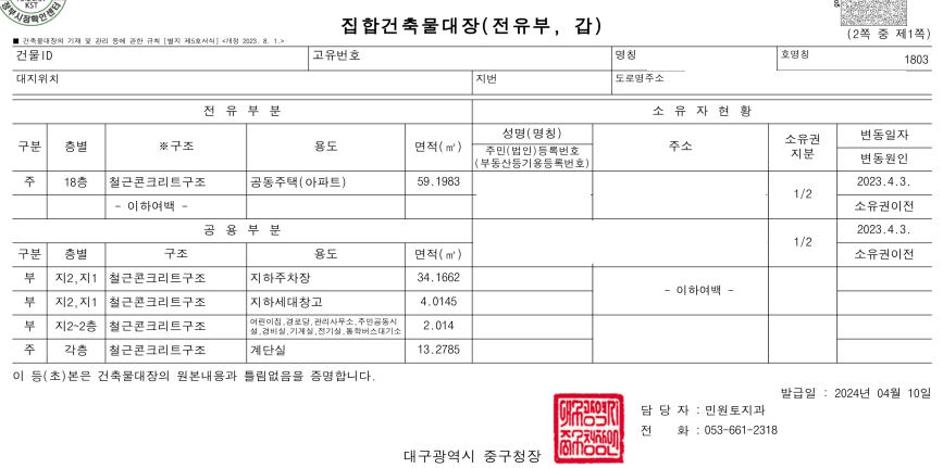 집합건축물 대장 전유부에서 해당 건물의 정보 및 소유자 현황을 확인할 수 있습니다.
