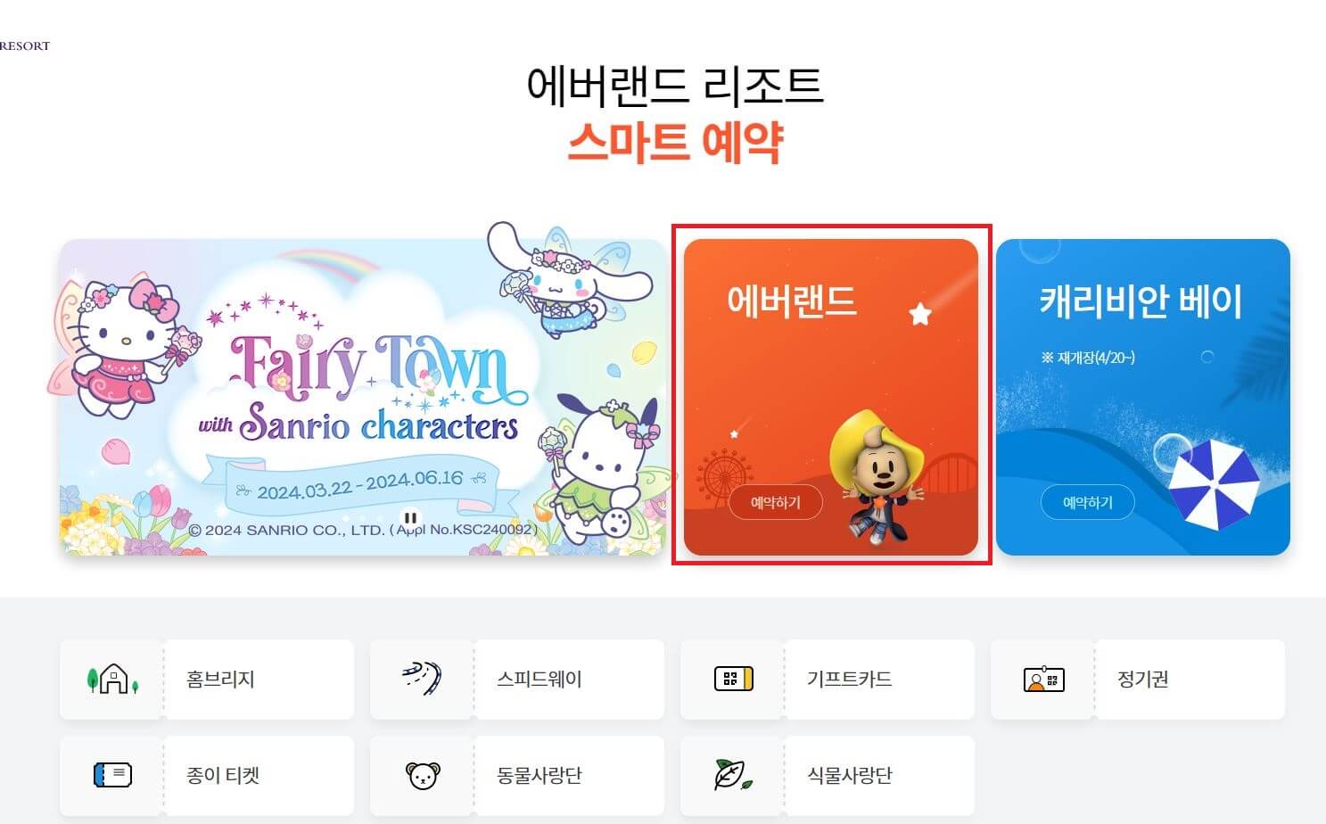 에버랜드 스마트예약 홈페이지 접속되셨다면 빨간 네모박스의 에버랜드를 선택하시기 바랍니다.