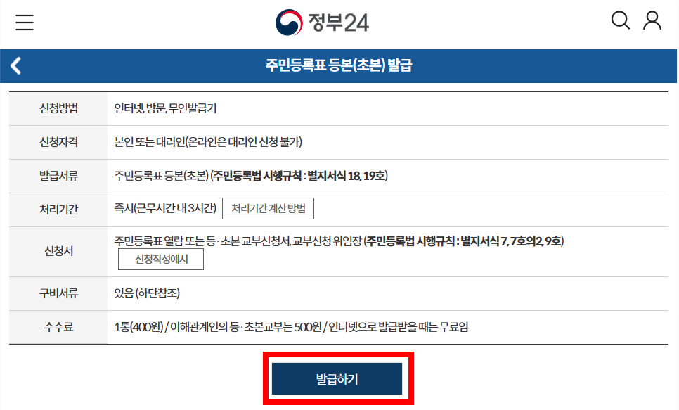 주민등록초본 발급비용은 방문신청 시 1통에 400원이고, 인터넷 발급 시 무료입니다.