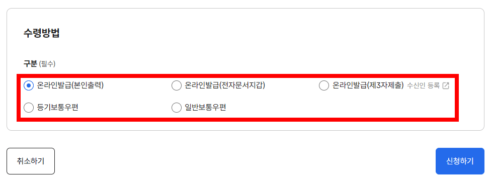 주민등록상 주소를 선택하시고, 발급형태 전체 또는 선택 발급을 용도에 맞게 선택하시기 바랍니다.