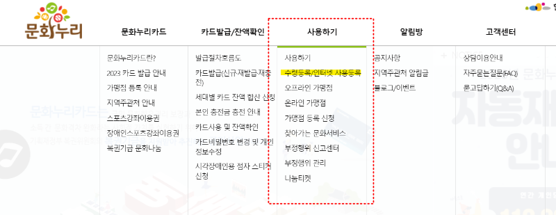 ①문화누리카드 누리집(www.mnuri.kr)에 접속한 후 사용하기 ▶ 수령등록/인터넷 사용등록을 클릭해 주세요.