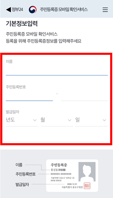 ③ 이름, 주민등록번호, 발급일자를 기입하면 간편하게 모바일 주민등록증이 발급됩니다.
