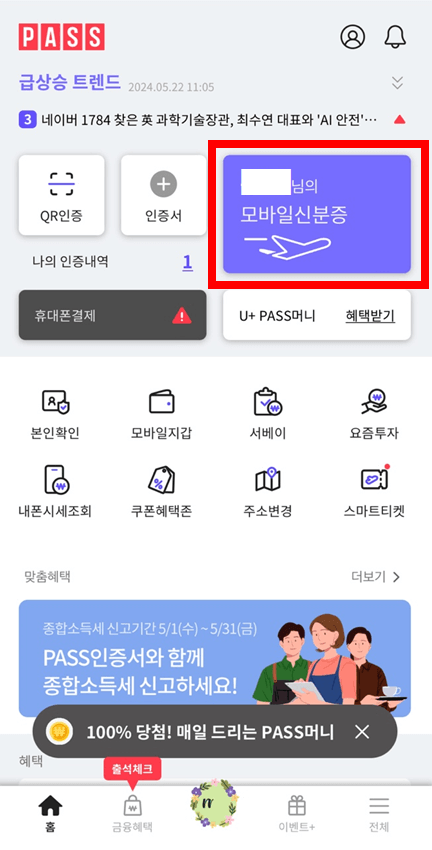 ① PASS 앱 다운로드 실행 후 로그인 후 아래의 화면에 모바일 신분증을 눌러줍니다.