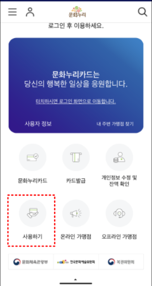 문화누리카드 모바일 앱에 접속하신 후 로그인해 주세요. 그 후 사용하기 메뉴를 눌러 카드수령등록을 해주시면 됩니다.