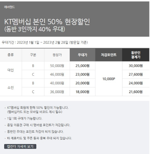 에버랜드는 가끔 SKT도 이벤트성으로 할인을 하긴 하지만 주로 KT멤버십 할인을 많이 하더라고요! KT 사용하시는 분들은 본인 50%, 동반 3인까지 40% 할인되니깐 통신사 할인을 받는 게 제일 좋을 것 같습니다!