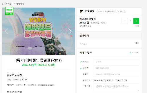 네이버 예약을 통해서도 에버랜드 할인권을 구매할 수 있습니다. 에버랜드 종일권 기준으로 42% 할인 중입니다.