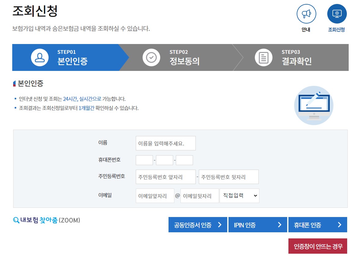 사이트에 접속하시면 3단계를 거쳐서 숨은 보험금을 찾을 수 있습니다.