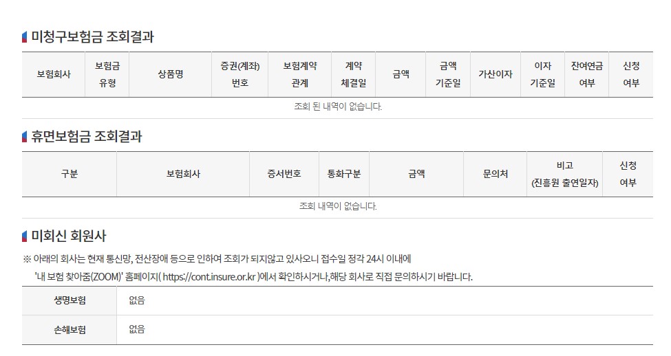 3. 결과확인(미청구보험금, 휴면보험금 결과 확인)