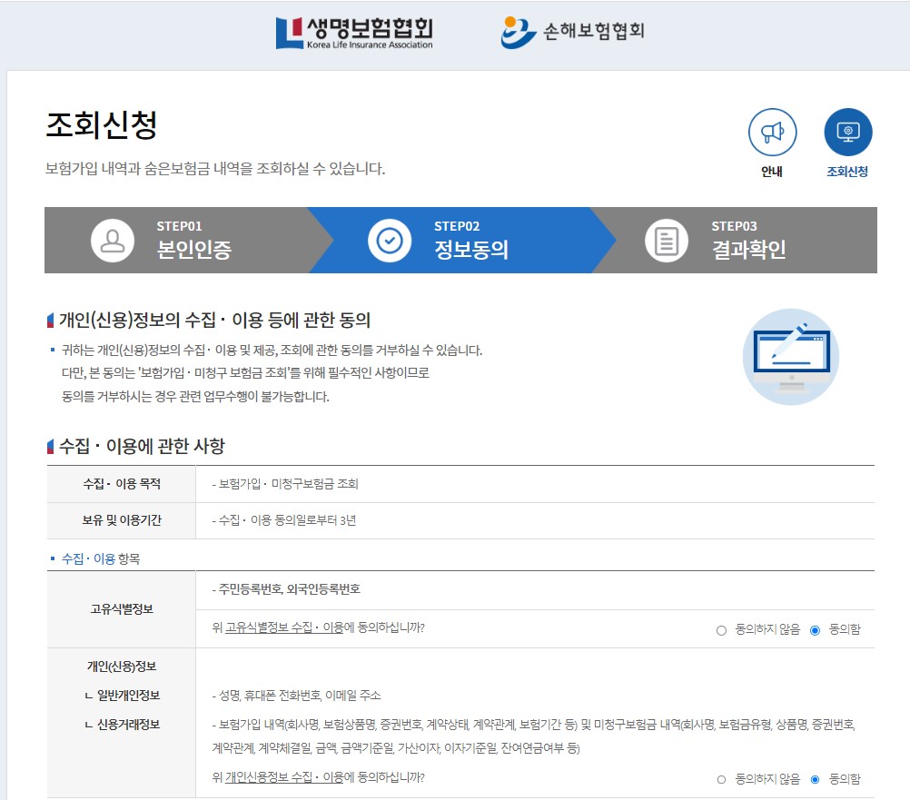 사이트에 접속하시면 3단계를 거쳐서 숨은 보험금을 찾을 수 있습니다.
