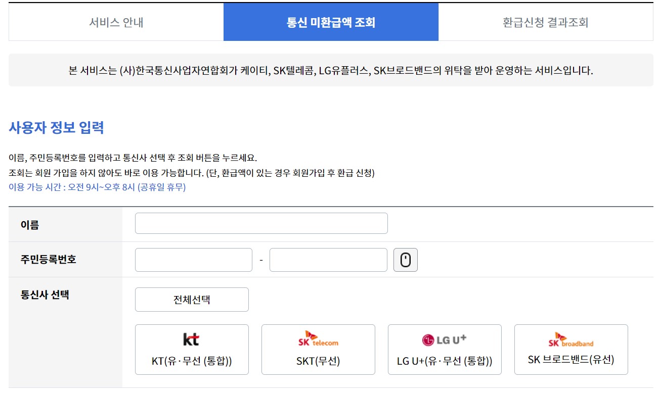 KT, SK텔레콤, LG유플러스, SK브로드밴드의 유,무선 서비스에 대한 미환급액 조회가 가능합니다.