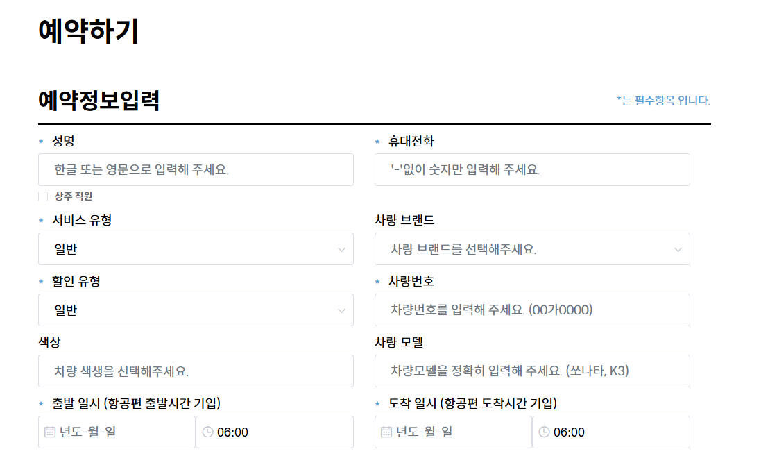 주차대행 서비스는 아래의 홈페이지에서 간편하게 성함, 차량 정보, 출발 및 도착 일시를 기입 후 간단하게 예약하실 수 있습니다.