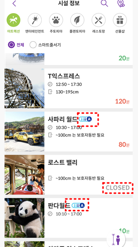 하지만 같은 A영역의 어트렉션인 사파리월드와 T익스프레스는 동시에 스마트 줄서기가 불가능합니다.