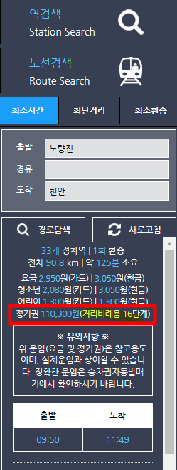 노량진 <->천안을 이용한다고 가정하면, 이 노선은 거리비례용 16단계가 적용되어 정기권은 110,300원입니다. 노량진-천안 노선을 교통카드로 이용하면 1회 운임비가 2950원이므로 2950*60=177,000원입니다. 따라서 지하철 정기권을 이용하시면 66700원이나 세이브 가능합니다.